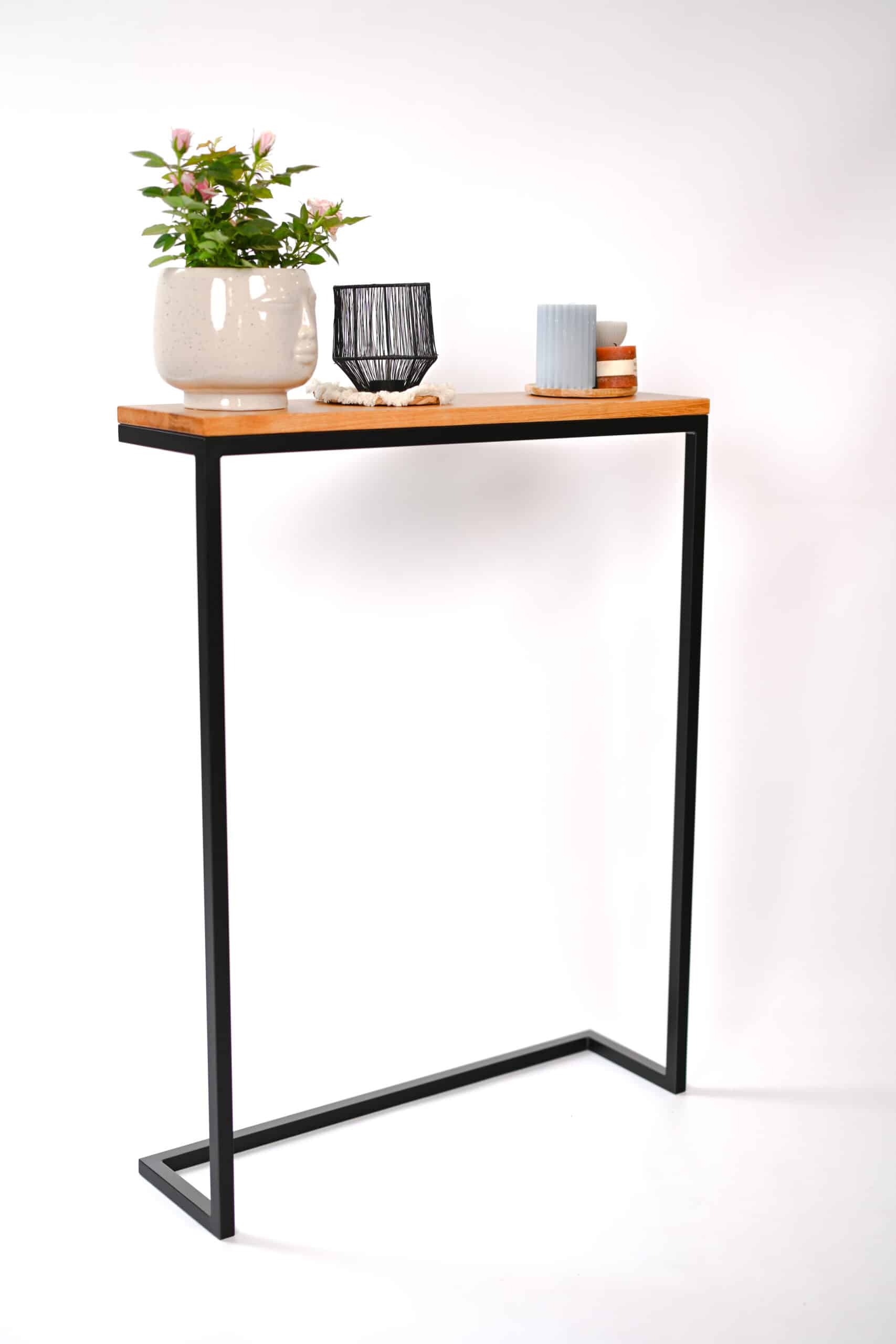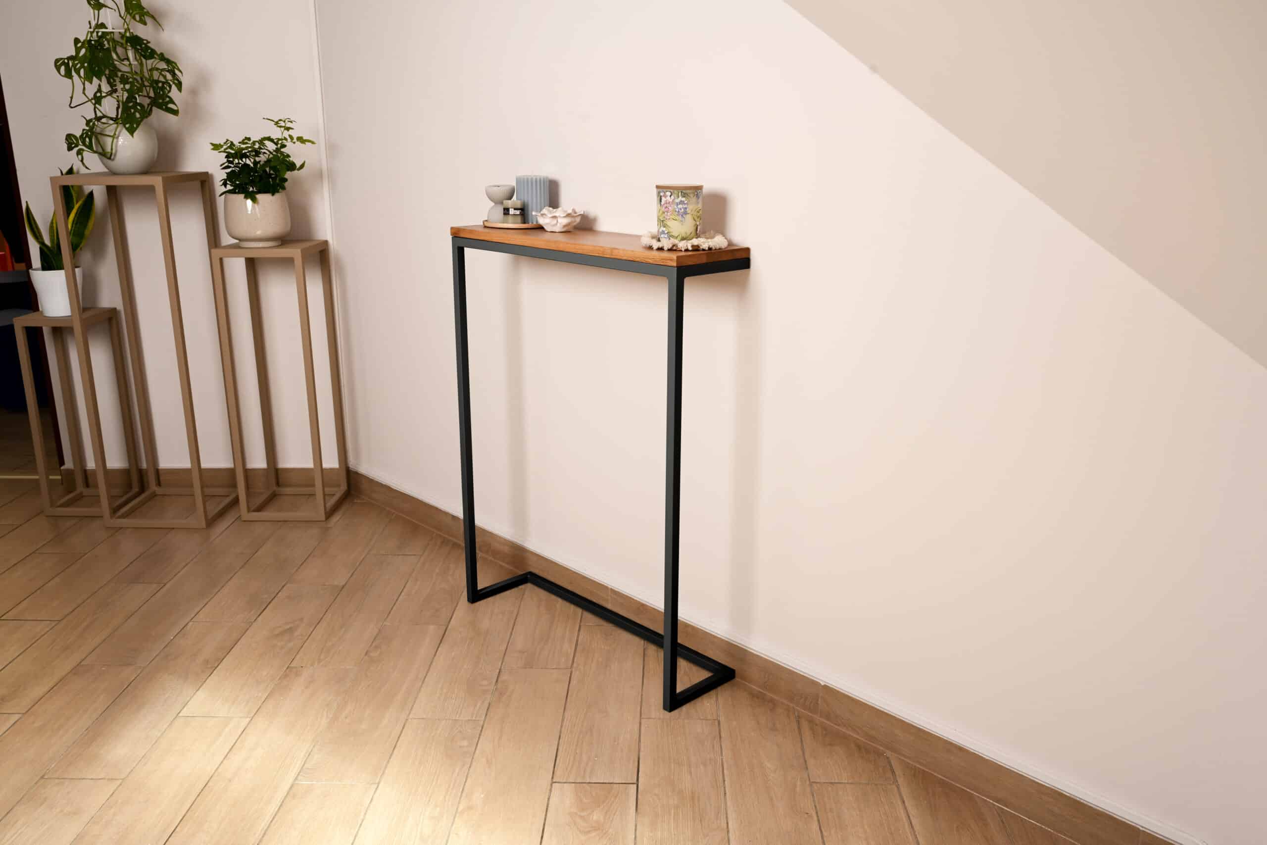 Ta konsola zapewni stabilne podparcie dla Twoich przedmiotów, stanowiąc wyjątkowy akcent w salonie, przedpokoju czy gabinecie. Głęboka czerń, wzbogacona dębem, nadaje wnętrzu głębi i stylu, doskonale pasując do nowoczesnych, industrialnych czy minimalistycznych aranżacji.