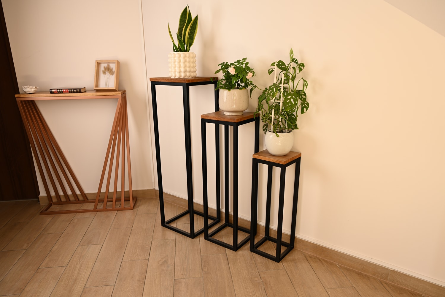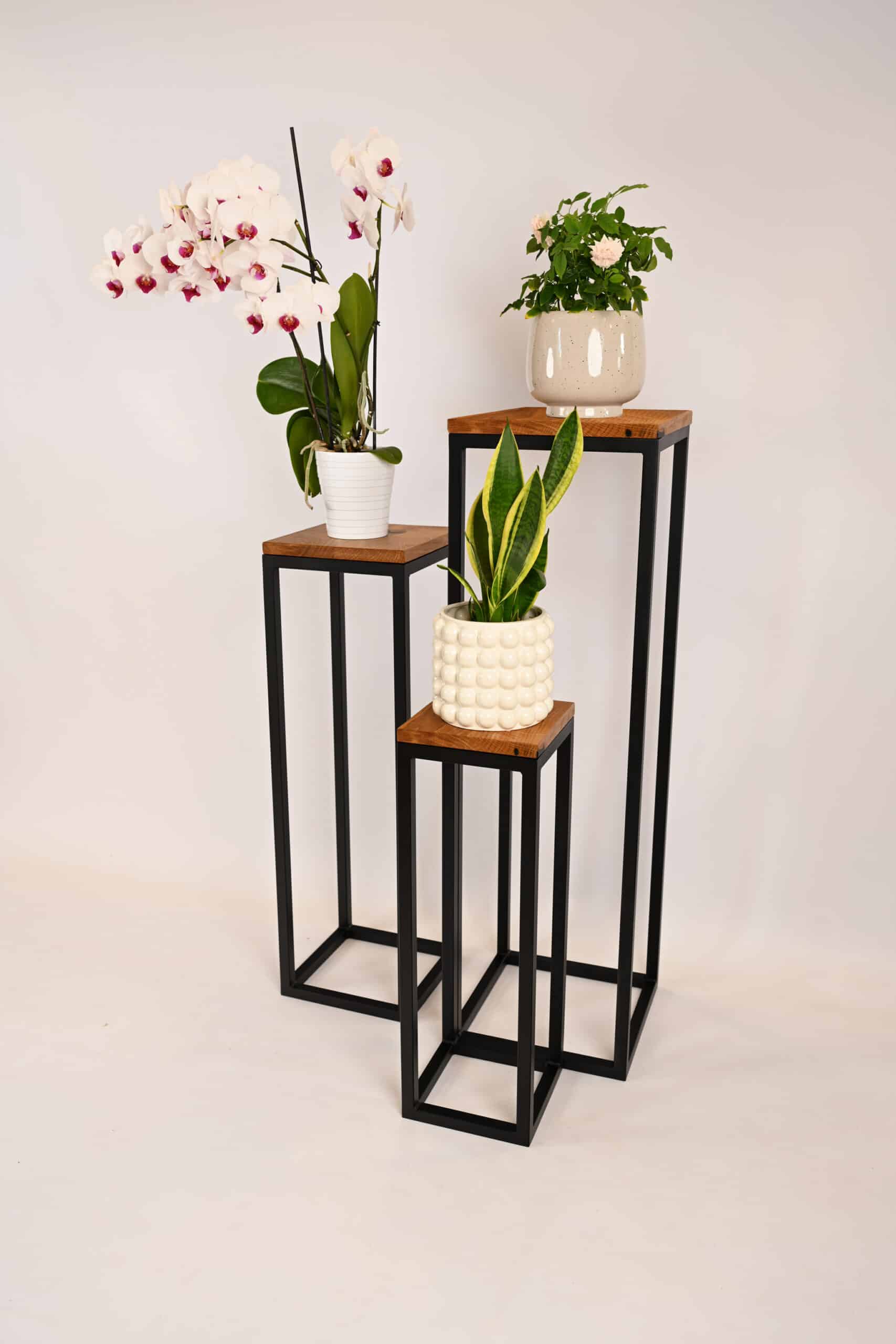 The solid construction offers reliable support for your potted plants, while the warm oak surface provides additional space for small decorations or planters. The deep black finish intensifies the green tones of foliage and the vibrant hues of flowers, making your plants stand out with dramatic elegance.