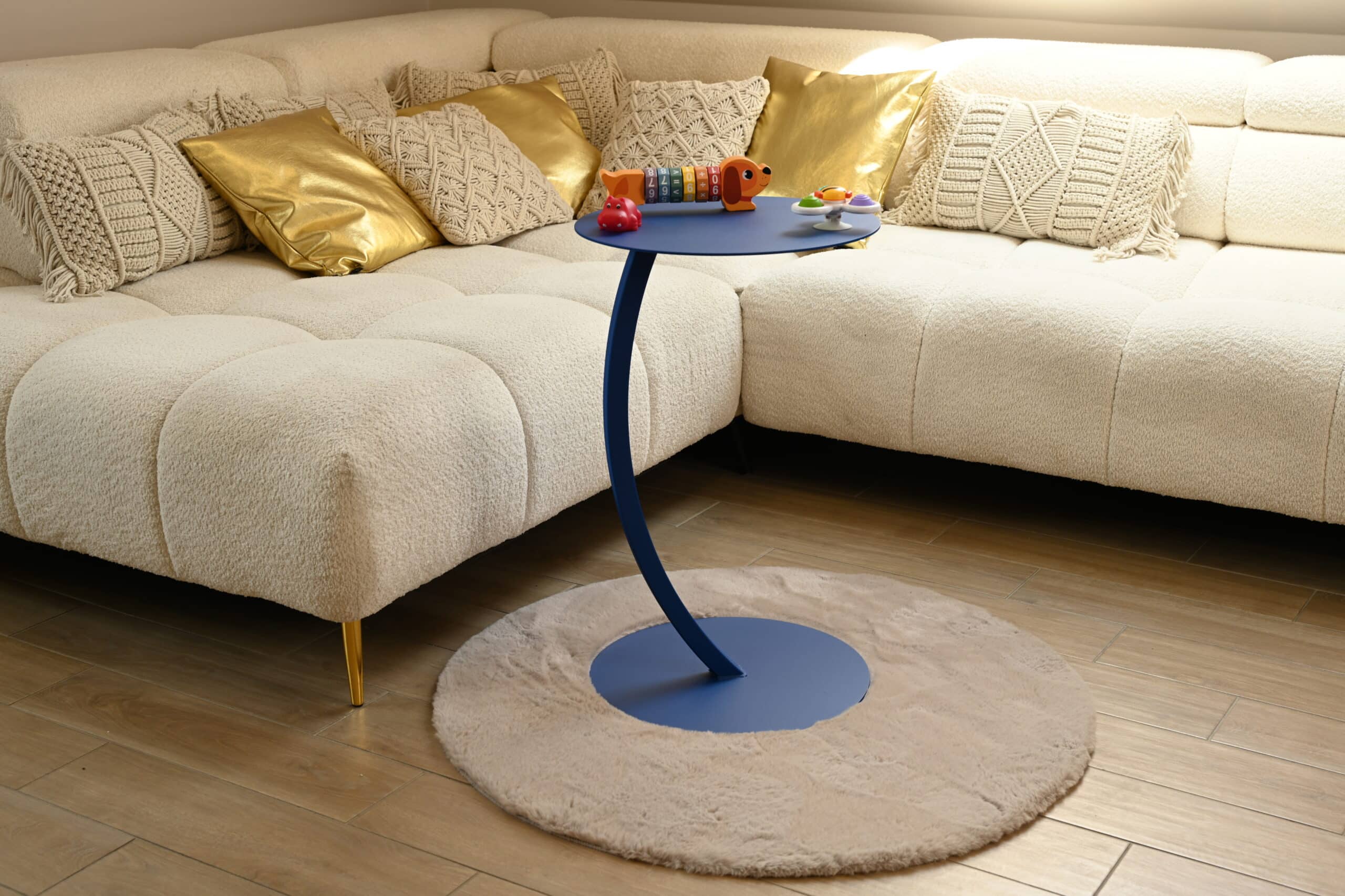 The Nonam Blue Screen table is more than just a beautiful piece of furniture – it’s also highly practical. As a side table, it works perfectly next to a sofa, offering a stylish surface for your favorite drink, a book, or a game controller. In a home office or reading nook, it becomes a discreet workspace for your laptop or documents. Its solid metal construction ensures long-lasting durability, while the easy-to-clean finish makes everyday maintenance effortless.